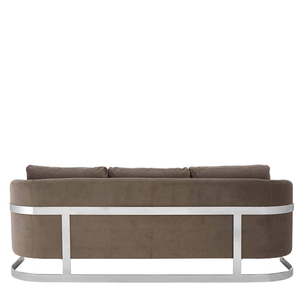 Item Code: 5502729 The Freda three seat sofa updates modern charm and sophistication with its metallic frame and sumptuous padding.With its slim armrests and low profile, this large three seat sofa commands attention without dominating its surroundings. Its upholstered with soft velvet and has a muted mink colour while a pair of scatter cushions contribute to the comfort. The sofa is supported by a curving metal frame which has a reflective finish to contrast with the upholstery.