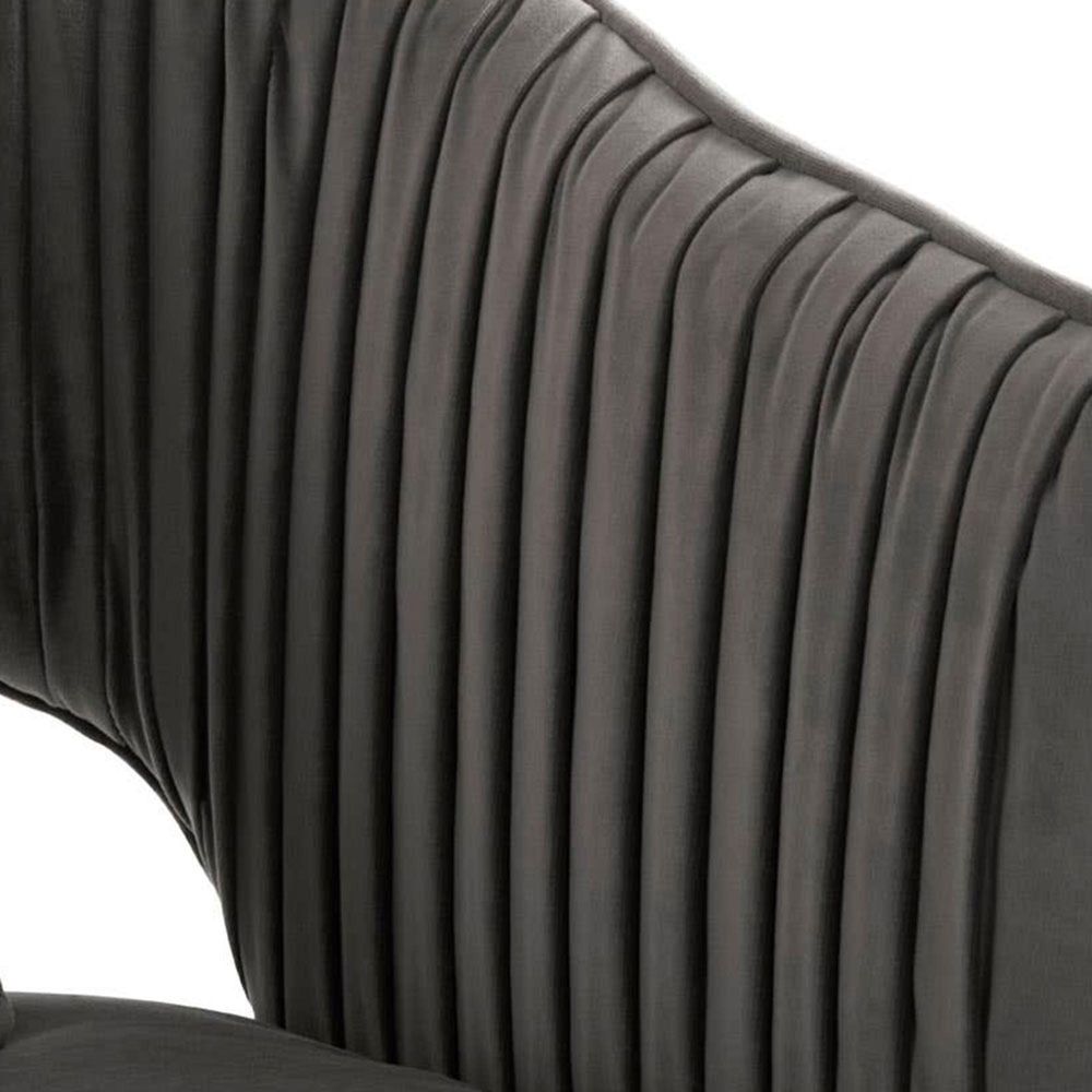 Item Code: 5502525 A chic and sophisticated statement piece, the Hendricks sofa's back boasts a unique cut-out design to complement modern home decor.The tactile grey velvet upholstery has been pleated on the sofa's backrest, adding a sense of texture. Gold finish legs are slender and elegant and provide a stark tonal contrast to the muted tone of the soft upholstery. Two cushions perfectly finish this distinctive design piece and enhance its comfort.