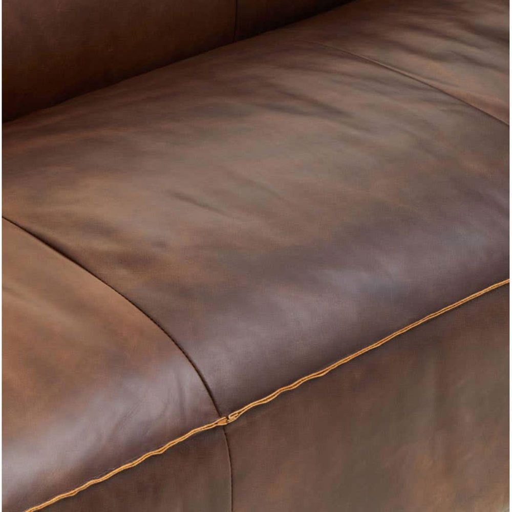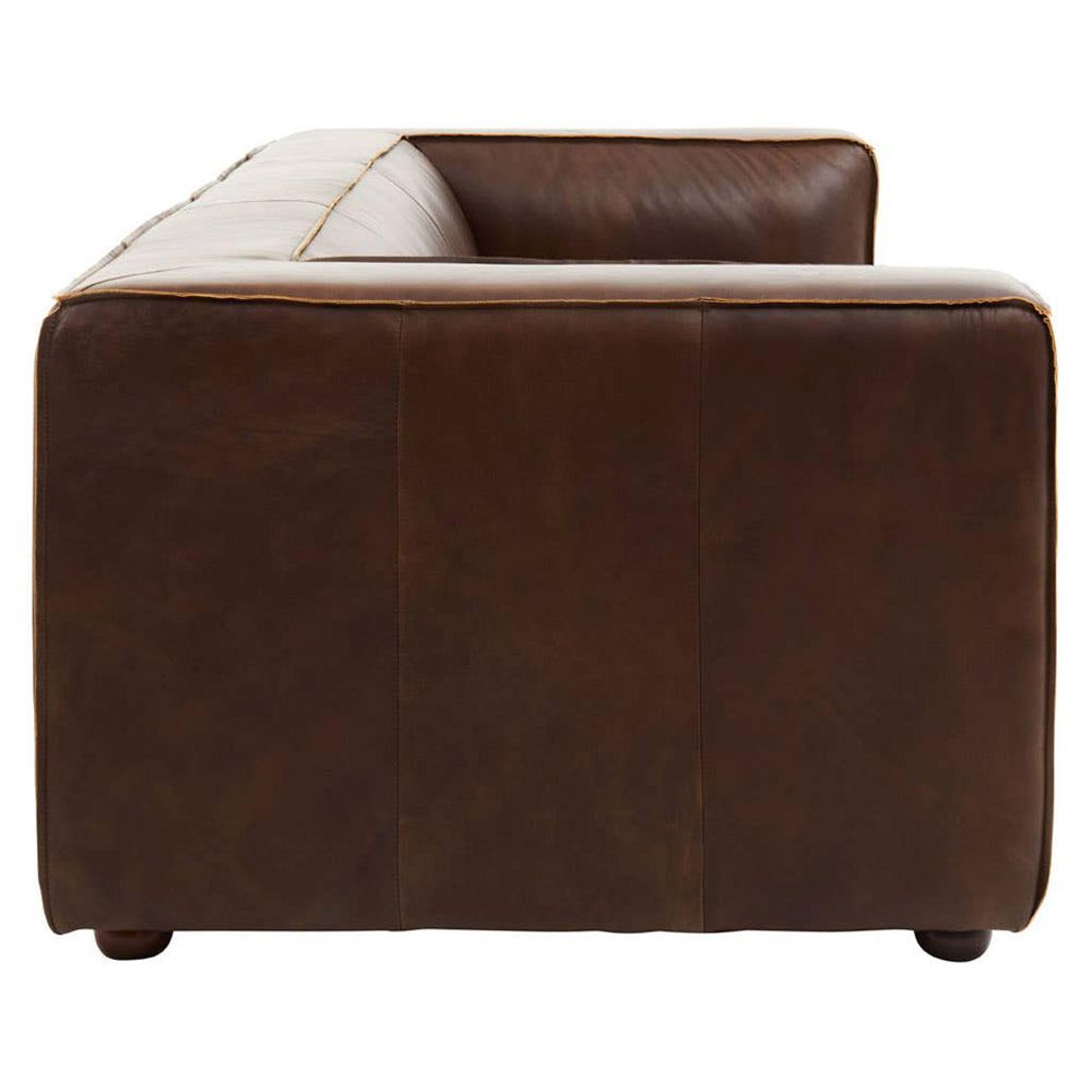 Item Code: 5528721 The King three seater leather sofa creates a warm and inviting aesthetic with plush cushioning in Mexico brown colour.This three seater sofa features genuine leather upholstery that exudes elegance. It features a modern minimalistic aesthetic with a low back, track arms and a clean trim. The legs are made from durable and eco friendly rubberwood.