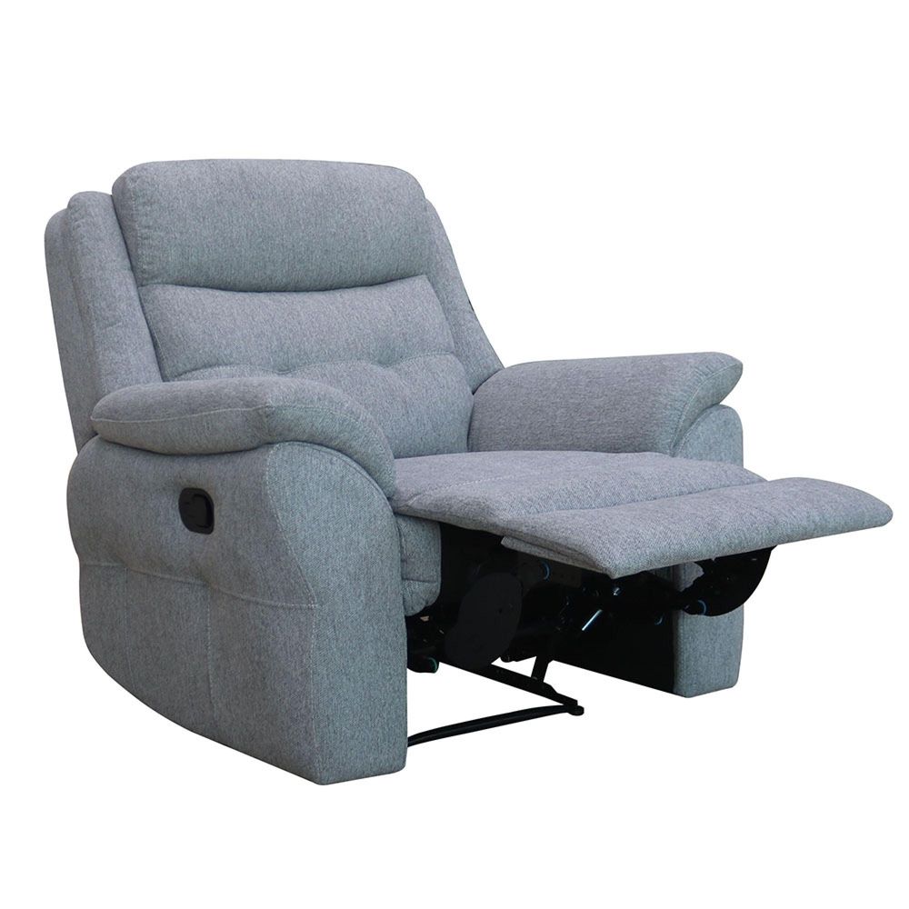 Full grey fabric upholstery, including armrests, seat, back, and base