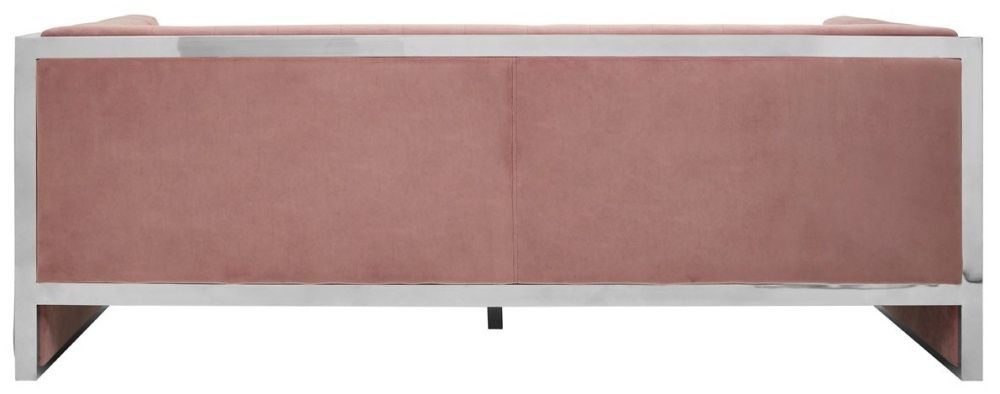 Item Code: 5501782 A large velvet and polished steel sofa designed to complement luxe interiors.The Vogue sofa is upholstered with sumptuous, pastel pink velvet. It features a large seating cushion that comfortably accommodates three people, with straight arms and geometric button tufted detail on its low profile backrest and inner sides. Its stainless steel frame follows straight, minimal lines to lend a contemporary touch to this opulent statement piece.