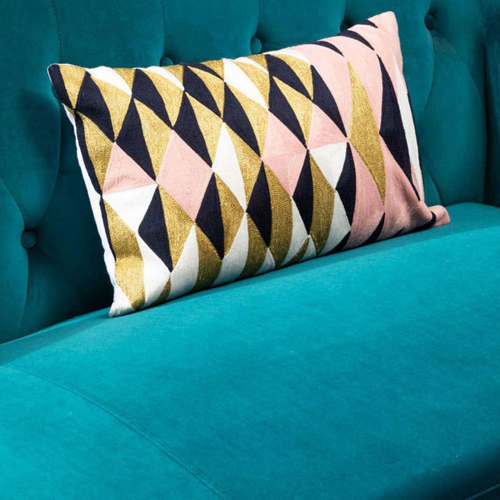 Item Code: 5501783 A large velvet and polished steel sofa designed to complement luxe interiors.The Vogue sofa is upholstered with sumptuous teal velvet. It features a large seating cushion that comfortably accommodates three people, with straight arms and geometric button tufted detail on its low profile backrest and inner sides. Its stainless steel frame follows straight, minimal lines to lend a contemporary touch to this opulent statement piece.