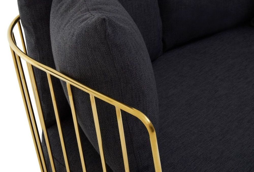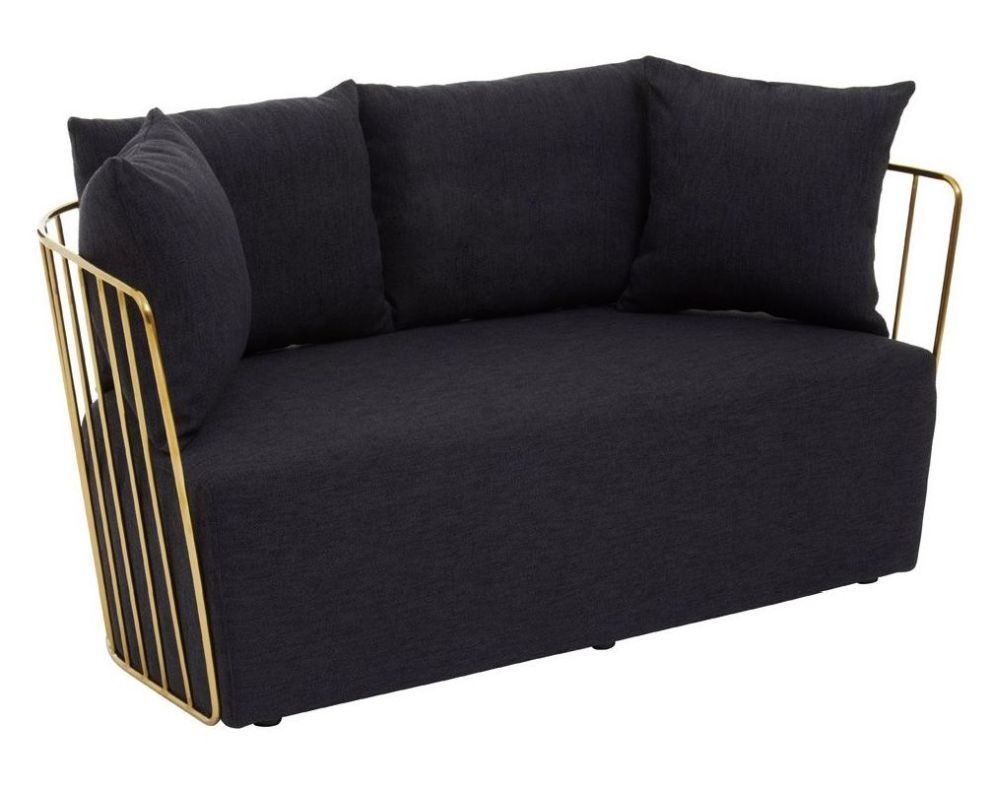 Item Code: 5528500 Azalea two seat black fabric sofa with four pillows and a gold finish stainless steel frame.This sofa lends an art deco allure to the area with the combination of black fabric and gold effect metal frame. A series of stainless steel bars create an angular profile, and the foam-padded seat with four pillows offers a cosy seating experience.