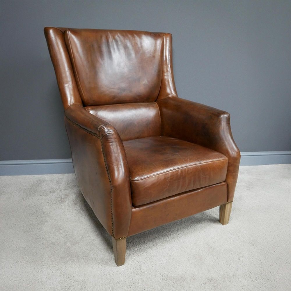 The "Reading" chair is hand crafted from 100% genuine Brazilian leather, with oak wood feet and metal stud detailing to finish Available in classic cognac colour.
