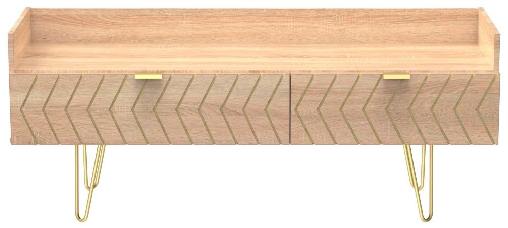 This modern TV unit offers a chic and stylish upgrade to any interior. Featuring two drawers adorned with hairpin legs in a Bardolino finish, it is crafted from durable particle wood for enhanced strength and stability. With plenty of room for all your media accessories, this is an ideal solution for housing your television and other electronic devices in one place.
