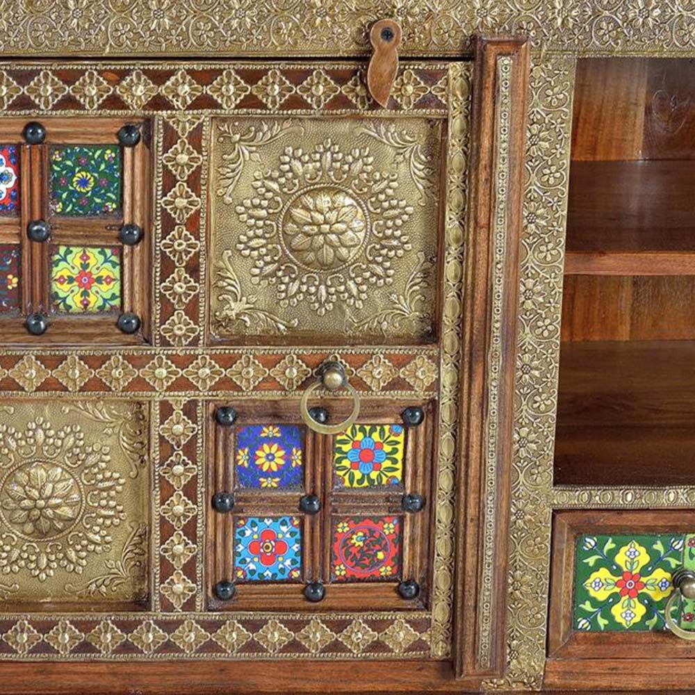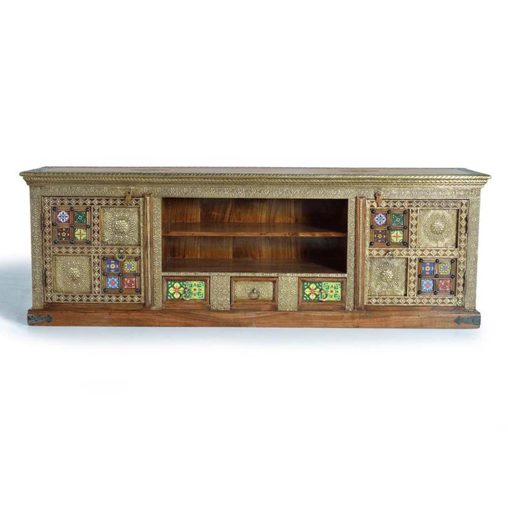 Item Code: 1287 Solid Acacie Wood Tv Console In Ethnic Style With 3 Draws , 2 Doors And Central Shelve With