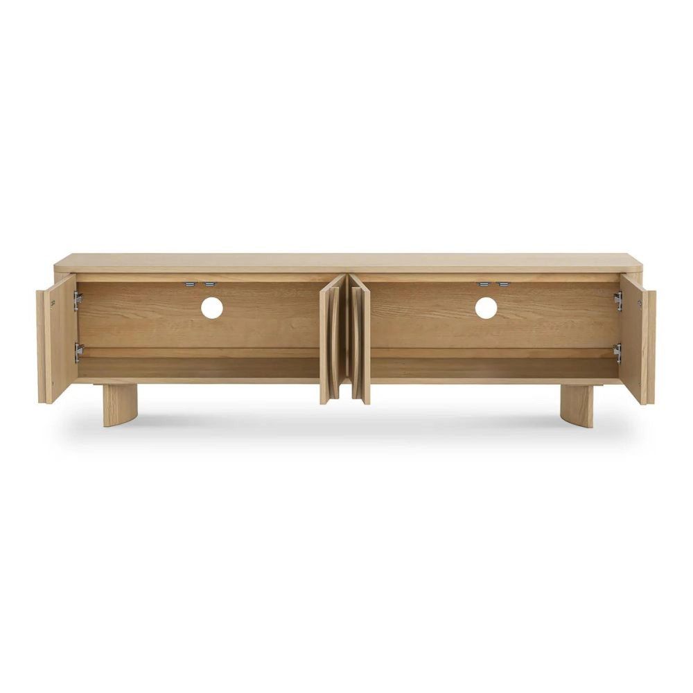 Designed for modern living, it features four spacious doors with integrated, recessed semi-circular wooden handles for a sleek, minimalist look. Inside, you’ll find ample storage for media devices, games, and accessories, keeping your living room neat and organised. The unit’s solid, block-style legs run along its depth, forming a sturdy, integrated base that adds stability and sophistication.