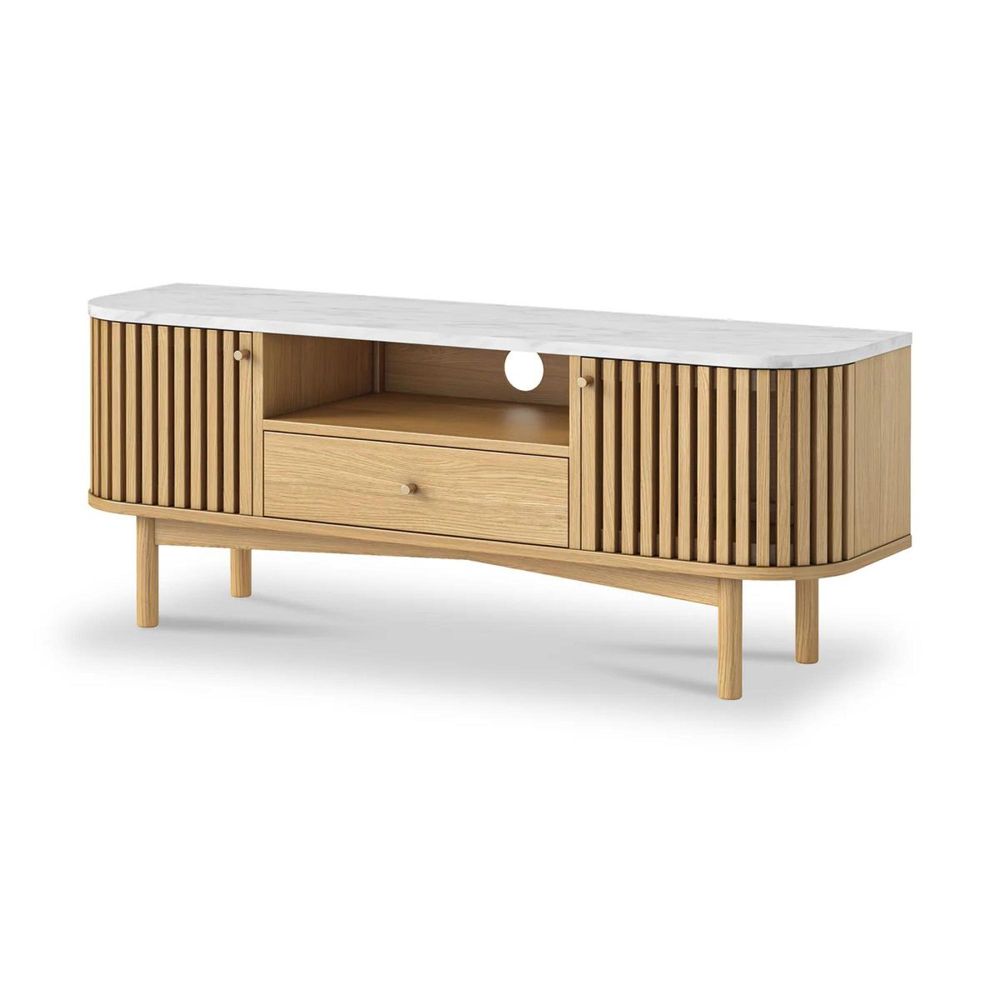 Add both style and functionality to your home with the Soho Oak 130cm Slatted Small Storage TV Unit – White Marble Top. Its premium materials, elegant design, and practical storage make it a versatile and timeless addition to any living space.