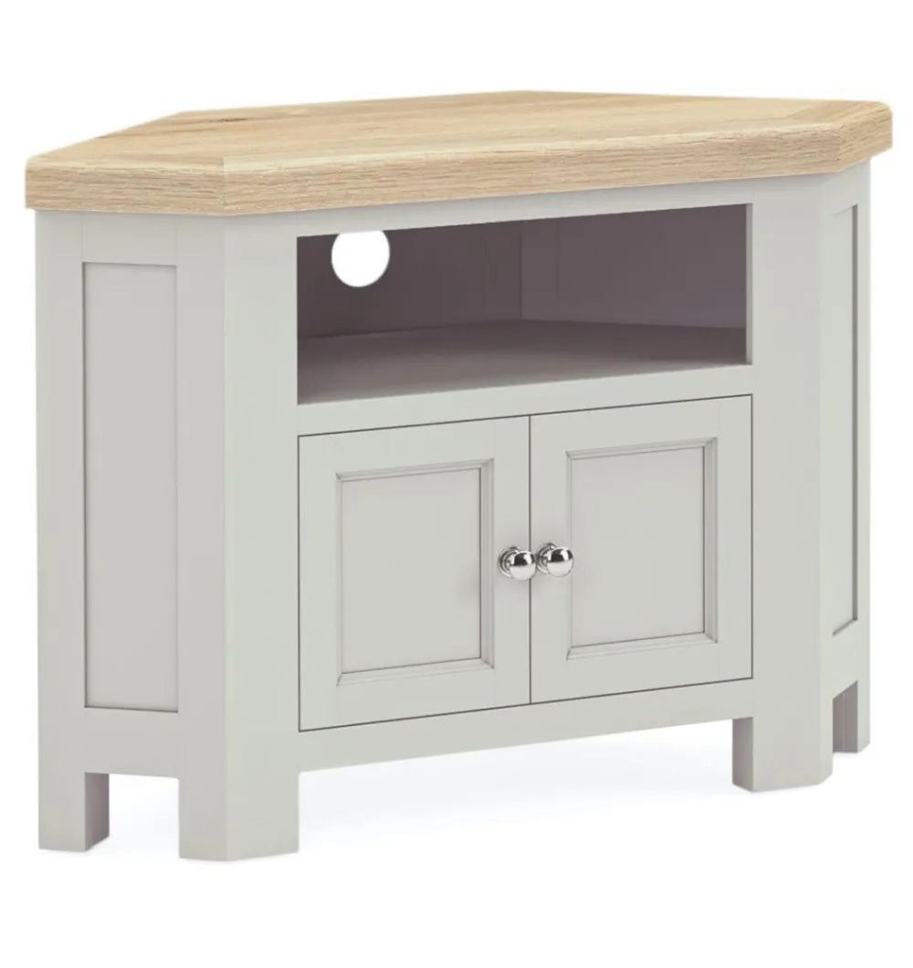 Item Code: 8297 The Salcombe Grey Corner TV Unit with 2 Doors combines functionality with contemporary style, making it an ideal choice for any living room or entertainment area. Finished in a sleek grey hue, this TV unit is crafted from high-quality materials to ensure durability and longevity. Its corner design optimizes space, making it suitable for rooms of various sizes. Featuring two cabinet doors with ample storage space for media accessories and equipment, the Salcombe Grey Corner TV Unit keeps your entertainment area organized and clutter-free. The open shelf above the cabinets is perfect for media devices or displaying decorative items. With its clean lines and modern aesthetic, this unit seamlessly blends with both modern and traditional decor styles, enhancing the functionality and visual appeal of your home entertainment setup.