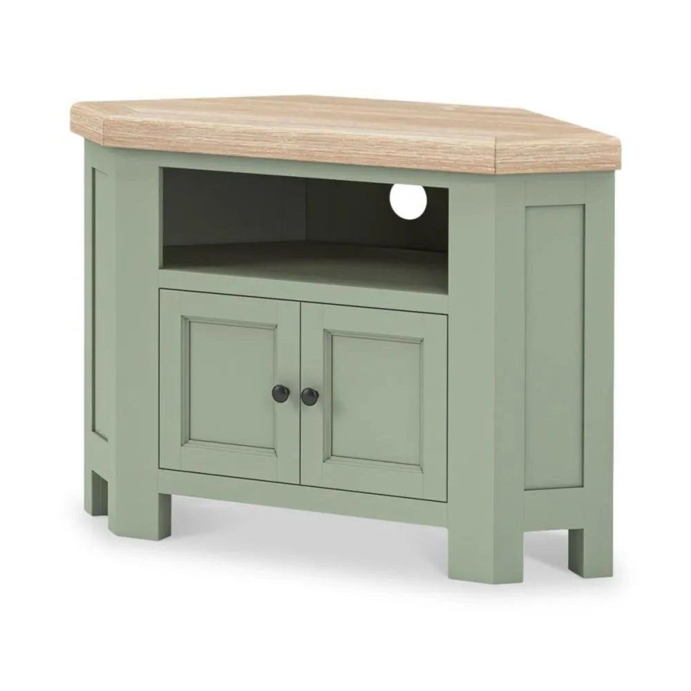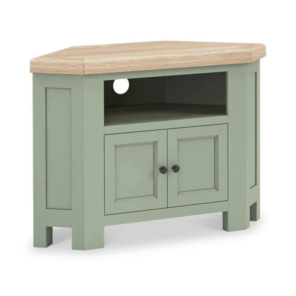 The sage green painted base adds a subtle pop of colour, while the natural oak-finished top highlights the wood’s beautiful grain, giving your room a rustic, country-inspired look. Perfect for both classic and contemporary interiors, this corner TV unit is a wonderful blend of form and function — offering ample storage without taking up too much space.