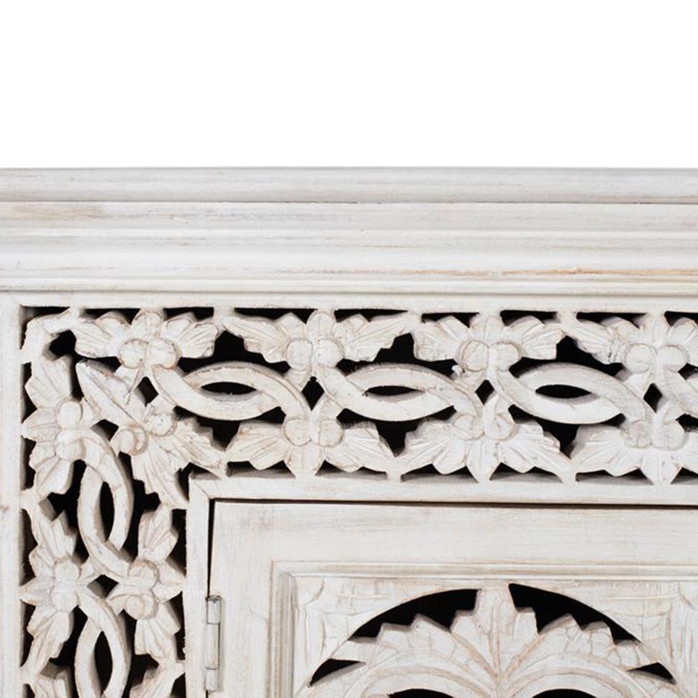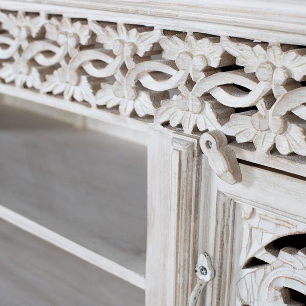 Item Code: 1518 Tv Cabinet Made Of Solid Mango Wood, In An Aged White Finish, With Two Doors And Hand-Carved Details And Interior Shelves. As This Is Natural Wood, It May Retain Its Original Knots And Grain.
