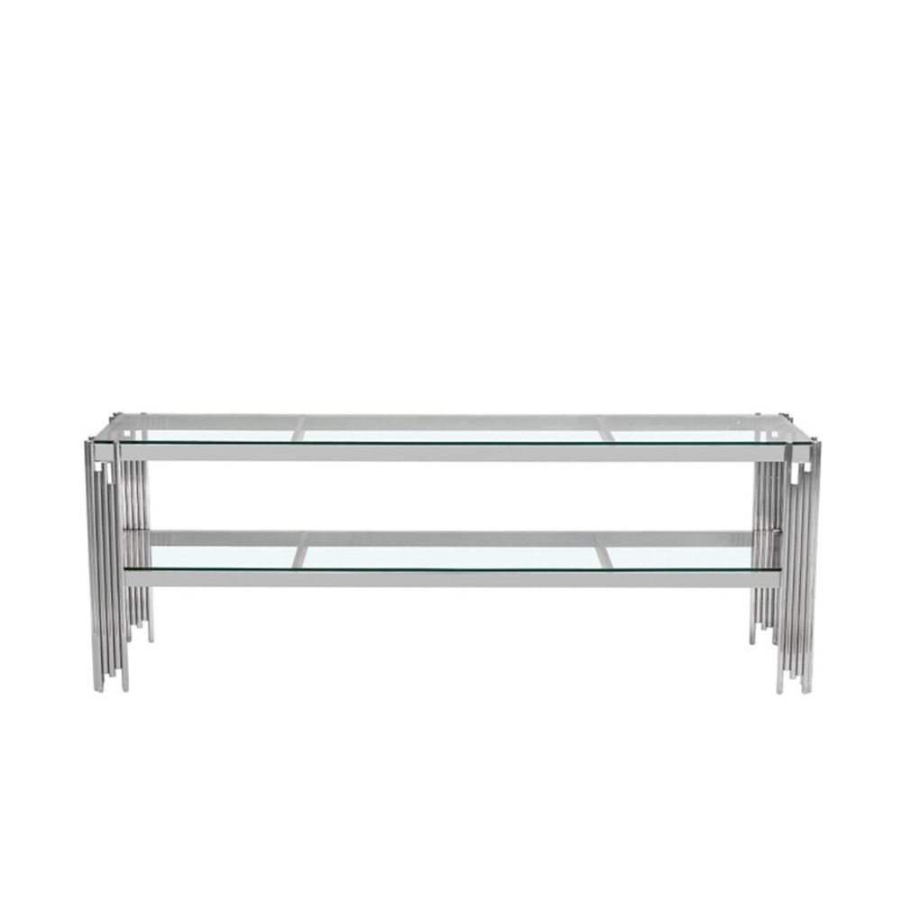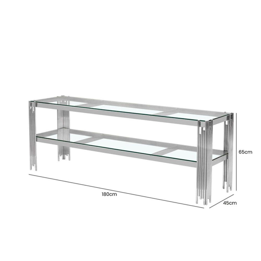 Item Code: SP-MF390-00-GLS-CH The Cohen Chrome Steel Tubes Entertainment Unit showcases a striking contemporary design, featuring a polished chrome tubular frame paired with two spacious clear glass shelves. Its open structure provides ample room for media devices, decor, or books, while maintaining a sleek, airy look. Perfect for modern living rooms, this unit blends style and function seamlessly.Please note that the product color and finish may slightly vary from the images due to lighting and screen differences.Free Delivery