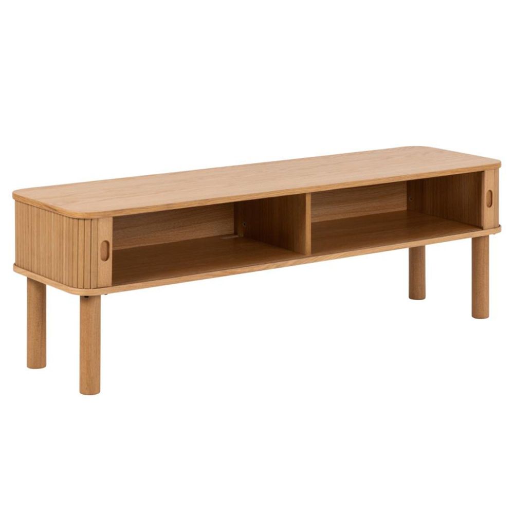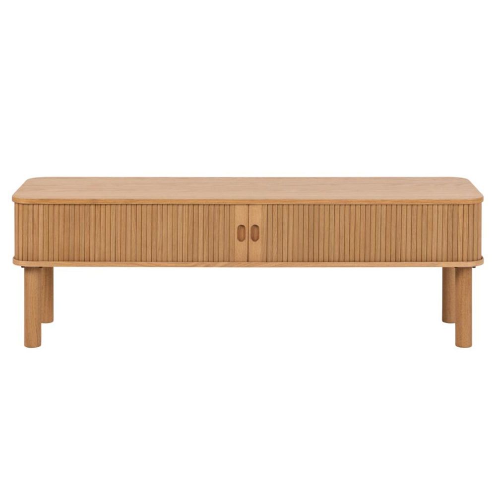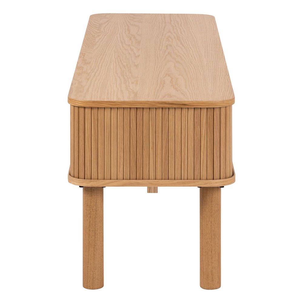 Item Code: 102750 Langley TV unit, top oak PU lacquered veneer, frame and 2 doors oak NC lacquered veneer, base NC lacquered oak with lamella front, sliding door and tambour door. Crafted in a rectangular form with round corners, the TV unit blends modern and natural aesthetics catering to various interior styles. It is the slatted decor, round character and lacquered oak accents that define the TV unit's signature look. Behind the door hides convenient storage.Free Delivery