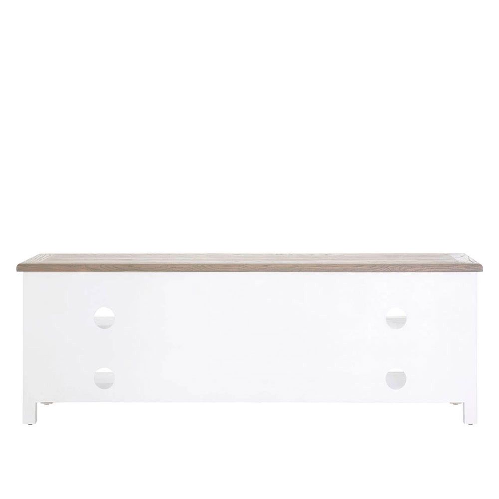 Item Code: 5501113 The Hampstead media unit is made from strong birch wood, notable for its simple lines.With four open shelves and a pair of drawers, this media unit provides ample storage and display space. Holes at the rear of the natural birch wood cabinet allow AV cables to be routed safely and neatly. The oak wood tabletop provides plenty of room for a television to be displayed, its rich brown colour complementing the cabinet's crisp white finish.