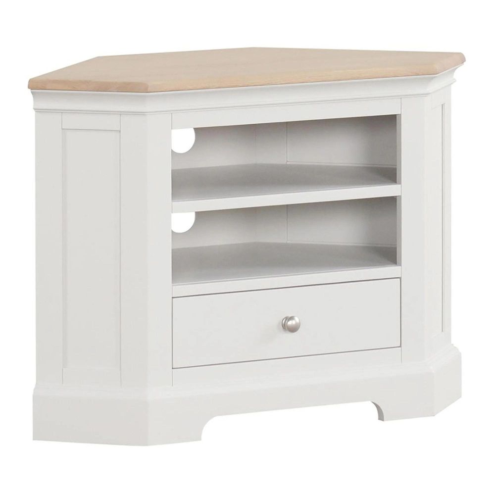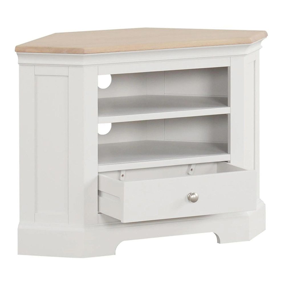 Maximise space without compromising on style with this beautifully crafted corner TV unit. Featuring a solid oak top, soft curves, and a smooth painted finish, it fits neatly into any corner. A convenient drawer keeps clutter tucked away, while the open section above is perfect for media players or d?cor. A smart solution with timeless appeal.