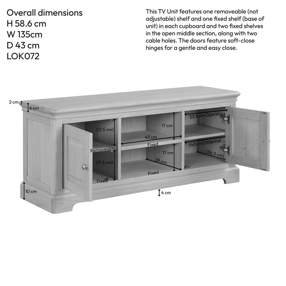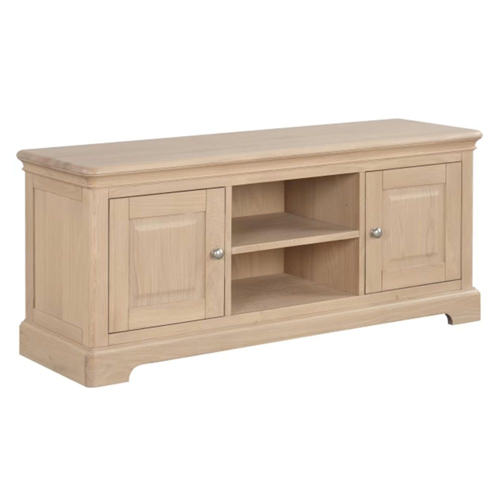 Item Code: LOK072 This spacious oak TV unit combines elegant style with practical features. With soft curves, a solid oak top, and a fresh smooth finish, it offers two roomy cupboards for hidden storage and an open middle section for your devices ideal for modern family homes with a country twist.