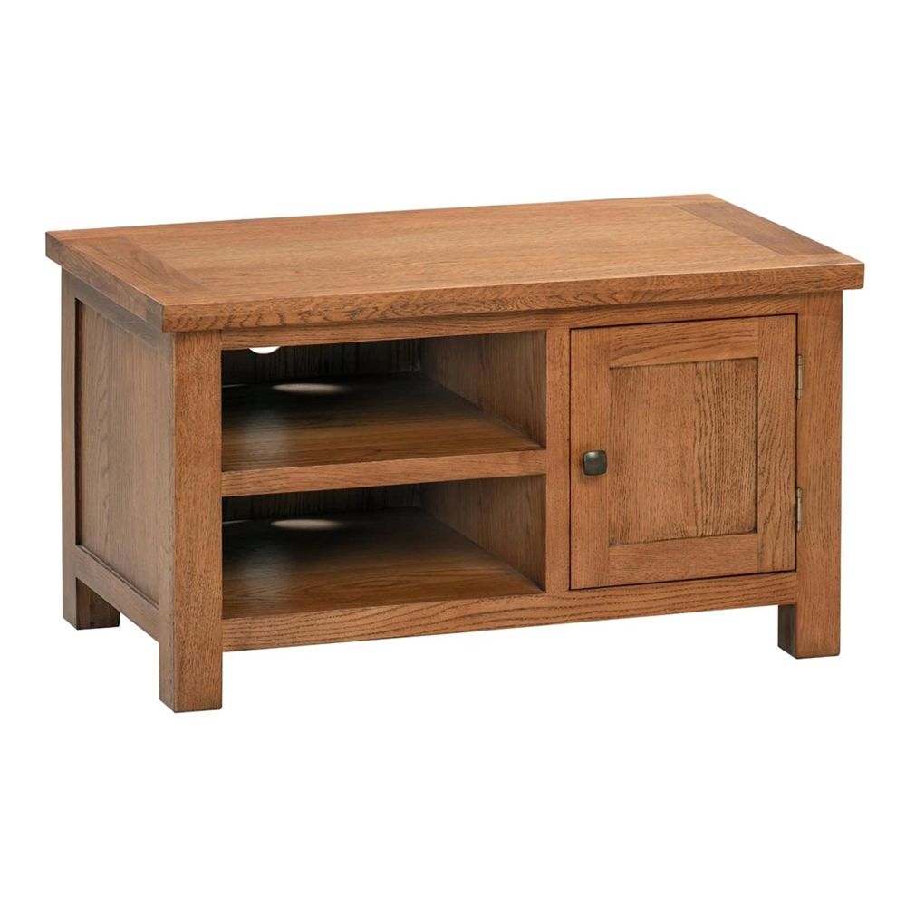 Item Code: DOR071R This standard TV Unit is perfect for smaller rooms, with two open sections and a small cupboard for storage. This piece has the added feature of wire holes in the back.