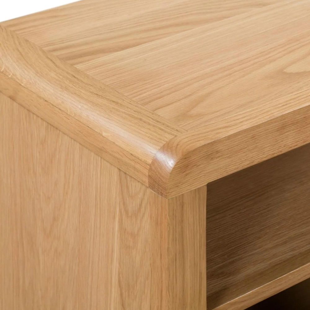 Item Code: CUR306 Crafted from solid oak and oak veneers, the Curve combines clean lines with a gentle curved ediging, adding a modern, retro feel to any dining area. The Curve TV Unit offers ample shelf space for set-top boxees, along with three small drawers perfect for DVD's and remote controls. Part of the Julian Bowen Curve Dining and Occaional Collection.