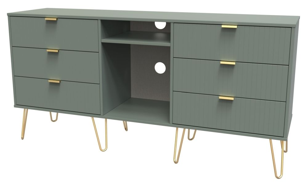 Item Code: LIF247RG This large TV unit brings style and storage together with 6 drawers to keep items organised. Made of durable particle wood and finished in a reed green colour, it stands on stylish hairpin legs giving it a modern look. Ideal for any home living and entertainment space.