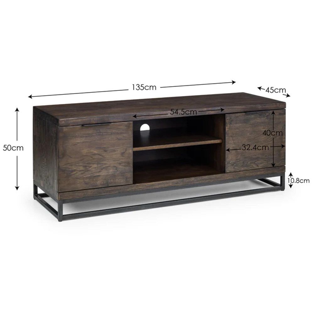 Item Code: BRO026 Made from solid oak, this TV Unit offers a rustic finish emphasising the stunning dark oak wood grain. The Brooklyn TV Unit offers a vintage edge featuring industrial style metal legs. Featuring two cupboards with shelves, and an additional shelf in the middle suitable for a console, this TV Unit is perfect for a wide range of modern decor. Part of the Julian Bowen Brooklyn Dining and Occasional Collection.
