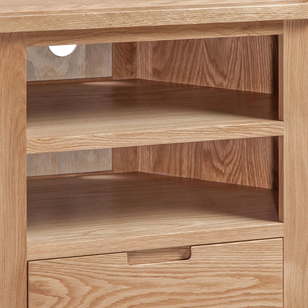 Bring refined craftsmanship and timeless charm into your living space with the Moderna Oak Corner TV Cabinet. Expertly built from solid oak and oak veneer, this piece blends enduring quality with a modern sense of style. The natural oak wood grain, enhanced by a smooth lacquered finish, highlights the material’s rich texture while providing protection and easy maintenance.