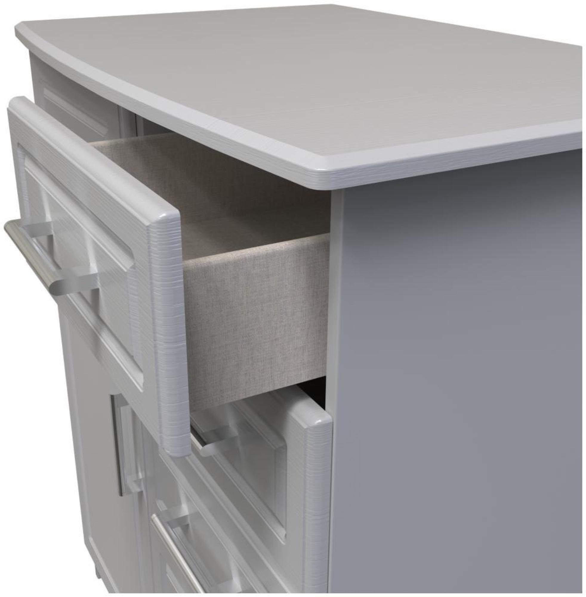 • Carcass: 18mm MFC furniture board, with ABS edging tapes (2mm)• Front: 18mm MDF , HTV Vinyl wrapped. With 2 mm edge. Routed pattern• Construction: Glued, dowelled and screwed. Metal KD fixings, castors wheel• Handle: Kent metal bar, Brushed nickel ,174mm in length• Door: 18mm MDF, HTV Vinyl wrapped. front with 2 mm edge• Hinge: Standard• Drawer:18mm MFC, HTV Vinyl wrapped . 3mm hardboard base, chipboard wrap with a 15mm wall. Soft close.• Top: 18mm MDF, HTV Vinyl Wrapped• Drawer Runner: Soft close York runner