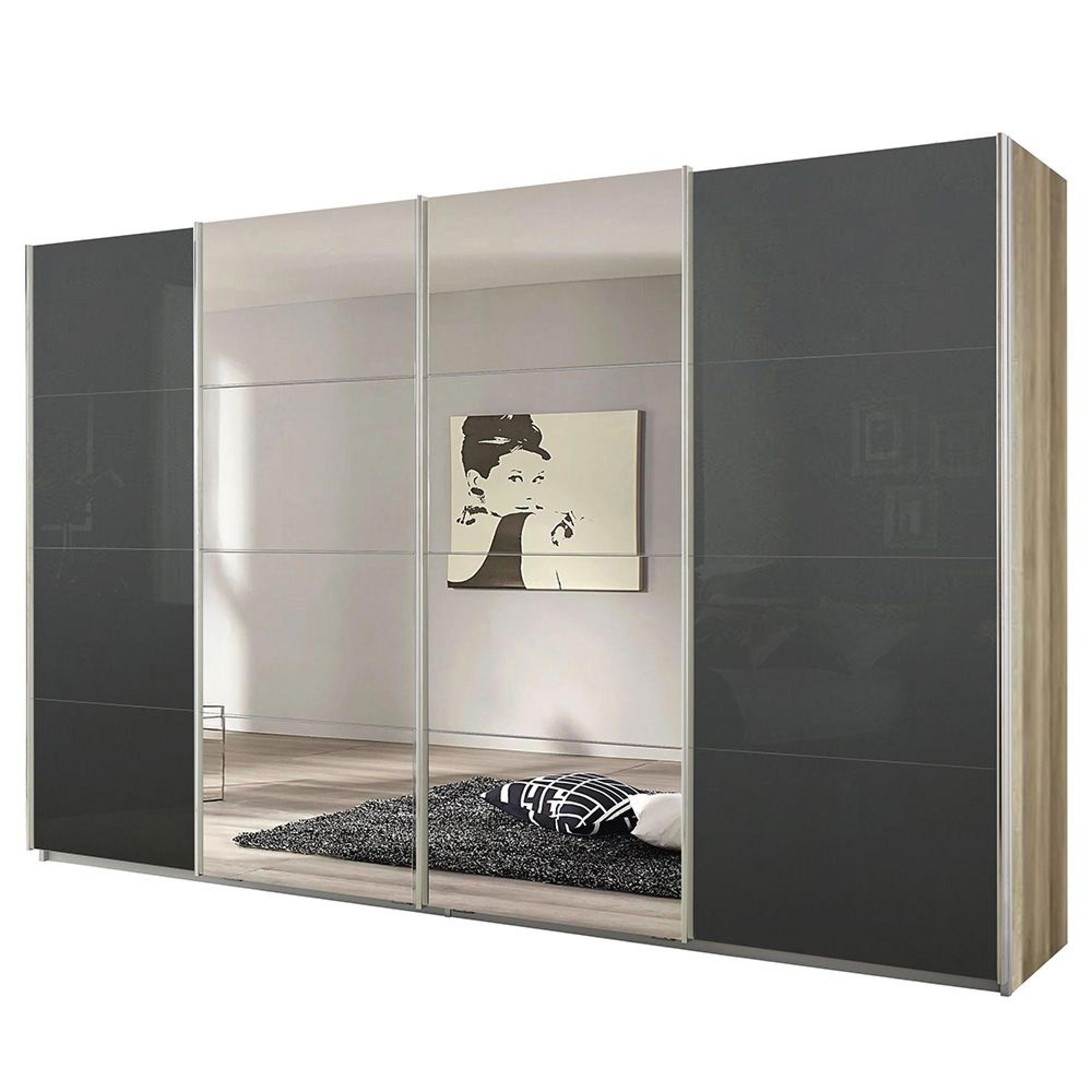 Rauch Syncrono 361cm 4 Door Sliding Wardrobe with Mirror - Sanremo Oak Light and Basalt Glass