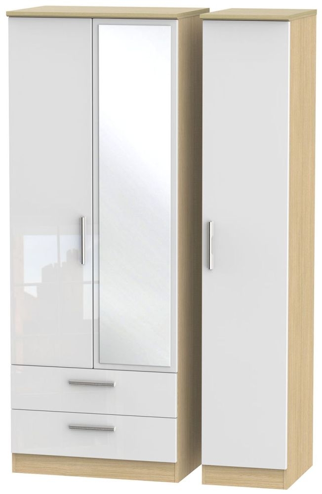 Knightsbridge Wardrobe - 3 Door - 1 Mirror - LHF 2 Drawer - Combi - Tall - White Gloss and Light Oak