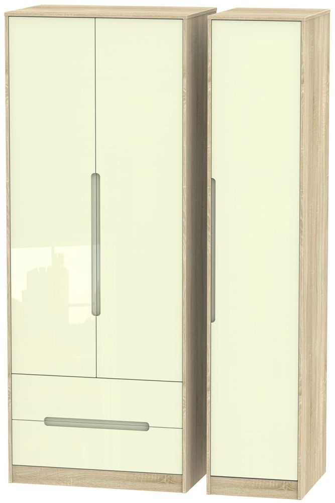 Monaco Cream Gloss and Oak Effect 3 Door Tall Triple Wardrobe - LHF 2 Drawers