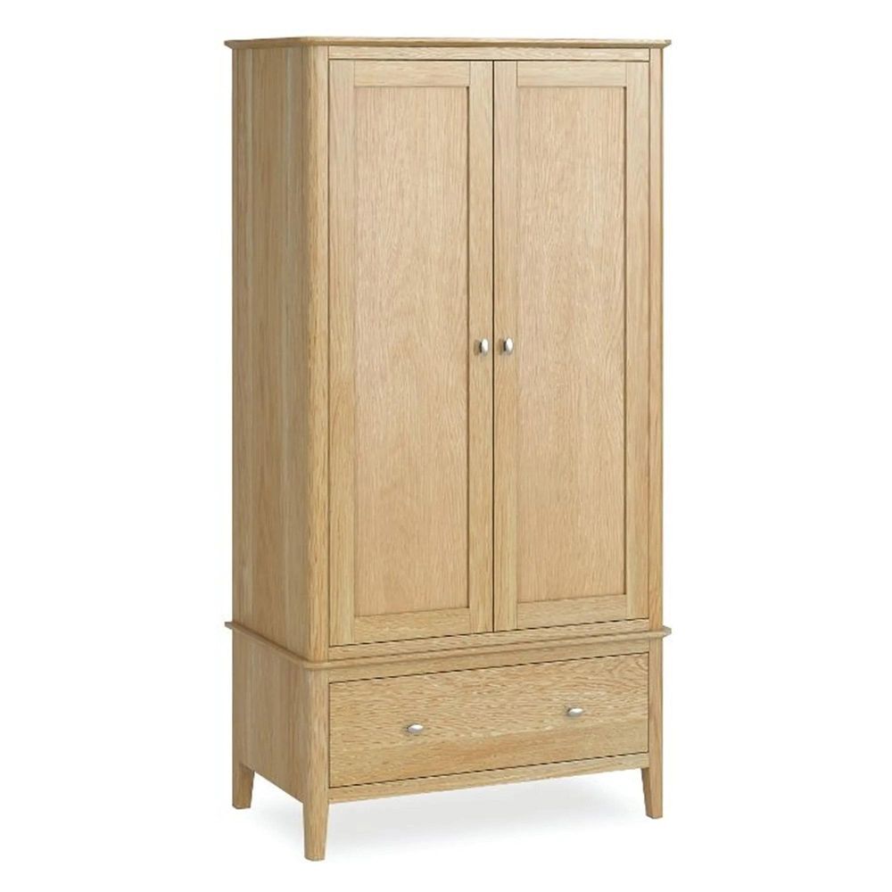 This wardrobe offers two spacious doors with hanging space for clothes, and a practical bottom drawer for folded garments, accessories, or personal items. Solid metal handles add a subtle modern touch, while the sturdy construction ensures long-lasting use. Perfect for bedrooms of all sizes, it complements other pieces in the Bath Oak bedroom collection.