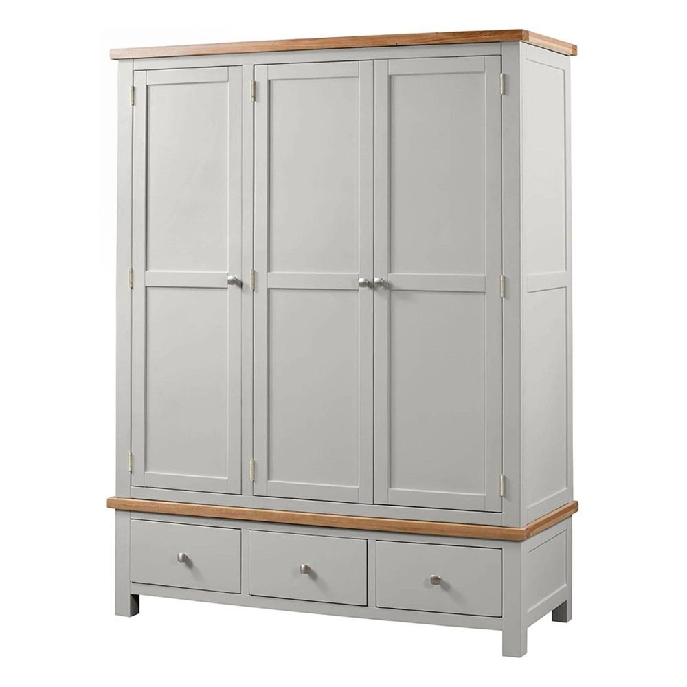 Bring timeless style and practical storage into your bedroom with the Lundy Grey Painted 3 Door Triple Wardrobe. Designed with a focus on craftsmanship and everyday functionality, this wardrobe combines generous hanging space with deep drawers, ensuring your clothing and accessories are neatly organised. Its grey painted body, complemented by a light oak lacquered top, adds a touch of warmth and refinement, making it a beautiful centrepiece for both modern and traditional interiors.