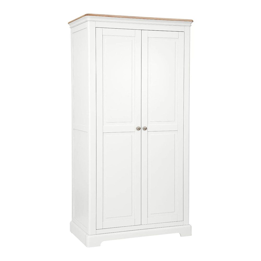 The wardrobe features a neutral white painted body, making it a versatile choice for modern and traditional interiors alike. Its light-toned, lightly lacquered solid oak top adds warmth and texture, while the moulded furniture cornices and plinths highlight its refined finish. Functional details such as metal knobs, sturdy door hinges, and foot levellers for uneven floors ensure durability and ease of use.