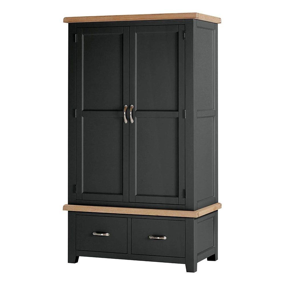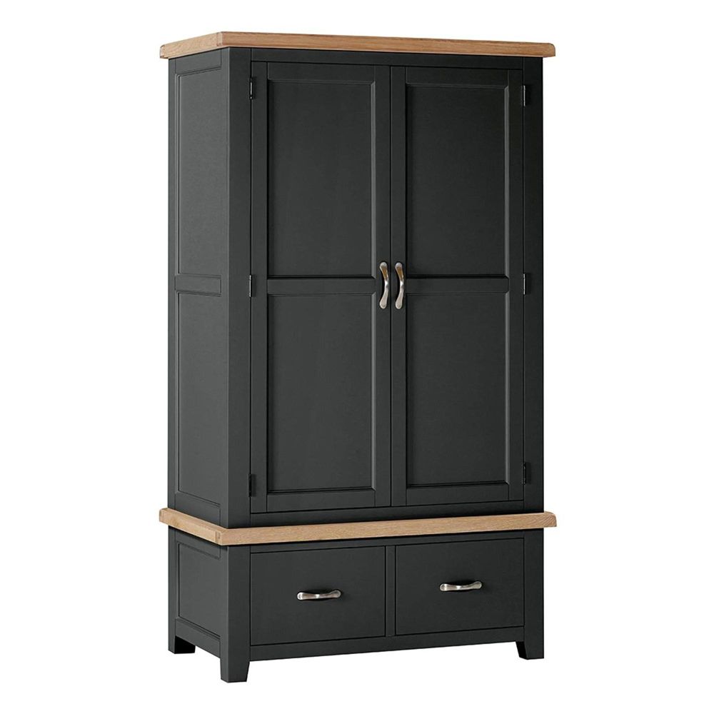 The Wilmont Black Painted 2 Door 2 Drawer Double Wardrobe blends timeless craftsmanship with modern functionality, making it a striking addition to any bedroom. Finished in a bold matte black with pale oak tops, this wardrobe offers a stylish contrast that suits both contemporary and traditional interiors. Designed with softened corners and sturdy block legs, it delivers a statement look while ensuring everyday practicality.