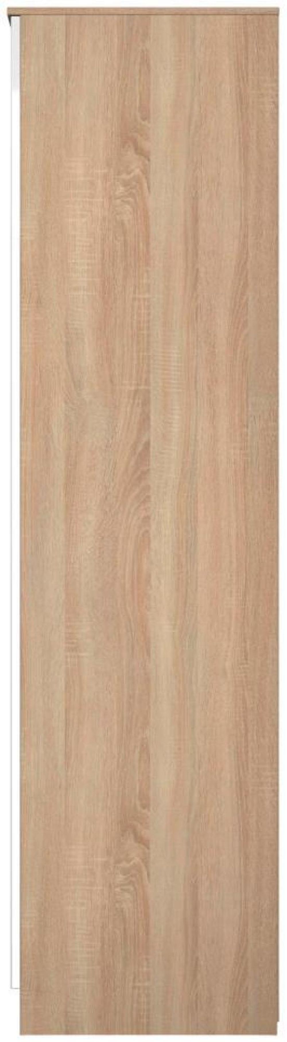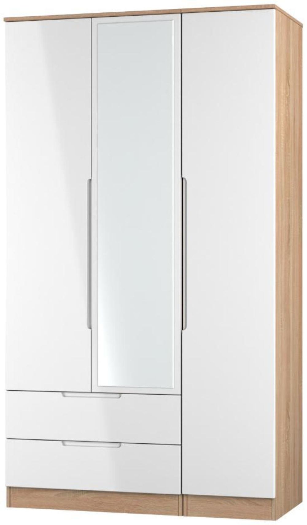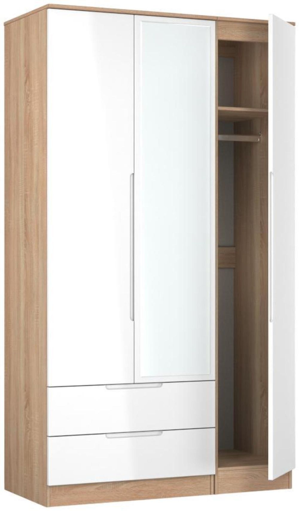 Milan White Gloss and Oak Effect 3 Door Tall Combi Wardrobe - 1 Mirror and LHF 2 Drawers