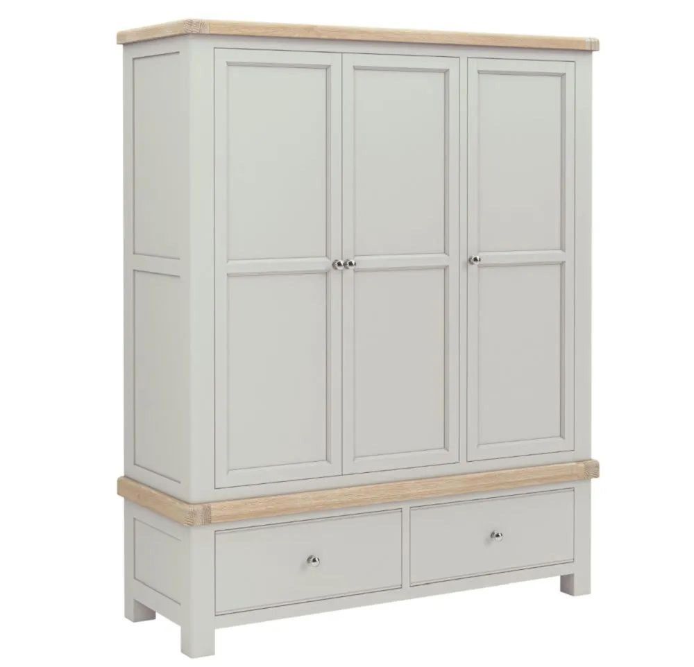 The Salcombe Grey Oak 3 Door Triple Wardrobe combines timeless style with practical storage, making it a perfect addition to any bedroom. Crafted with care from solid oak, oak veneer, and mixed woods, this wardrobe is designed to last for years while bringing a classic, refined look to your home. Its robust construction features chunky tops and legs, giving it a commanding presence while maintaining an elegant, rustic charm. The natural oak-finished top contrasts beautifully with the painted stone grey finish, creating a versatile piece that complements a variety of interiors.