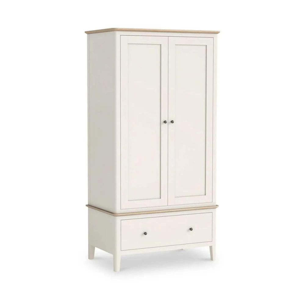 The Marlow White Painted 2 Door Gents Wardrobe is a practical and stylish storage solution, crafted to combine functionality with timeless design. Finished in a smooth coconut white or navy lacquered paint and topped with a natural oiled oak veneer, this wardrobe offers a refined look that suits both classic and modern interiors.