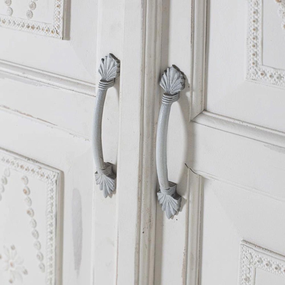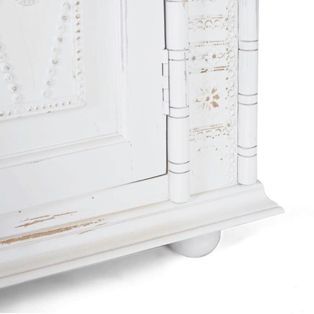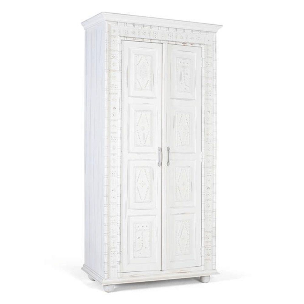 Item Code: 1919 The Wardrobe Is Made Of Mango Wood, And Its Distressed White Finish Gives It An Aged Look. Delicate Moldings At The Top And Bottom Add Sophistication To The Design. The Two Front Doors Are The Center Of Attention, Accented By Gold Metallic Details That Provide A Luxurious Contrast Against The White Patina. Inside, The Wardrobe Offers Ample Storage Capacity With Three Spacious Shelves, Ideal For Organizing All Types Of Clothing Or Accessories. The Base Of The Wardrobe Is Composed Of Four Turned Balls, Providing Stability And A Rustic Touch.