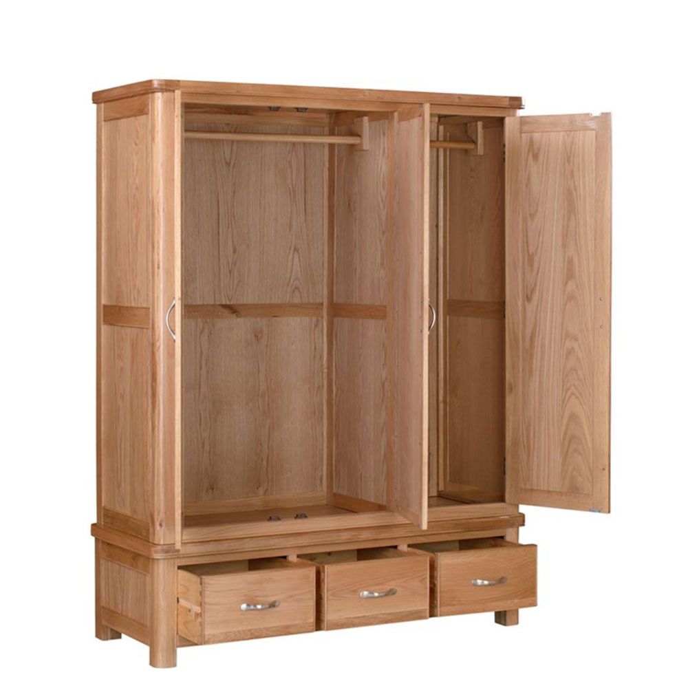 Item Code: 110-27 The Clarion Triple Wardrobe has two hanging areas, both full length: one is a double cupboard with a sturdy wooden hanging rail, the other a single cupboard. The robe has 3 drawers below and a mirror on the centre door. Manufactured in high grade oak the range is characterised by its curved corners, classic moulding and contemporary stainless steel handle.Free Delivery