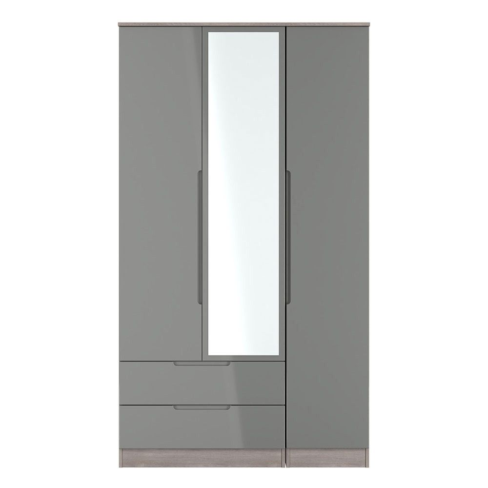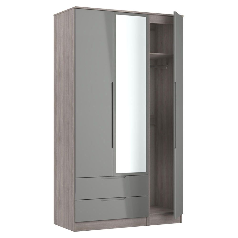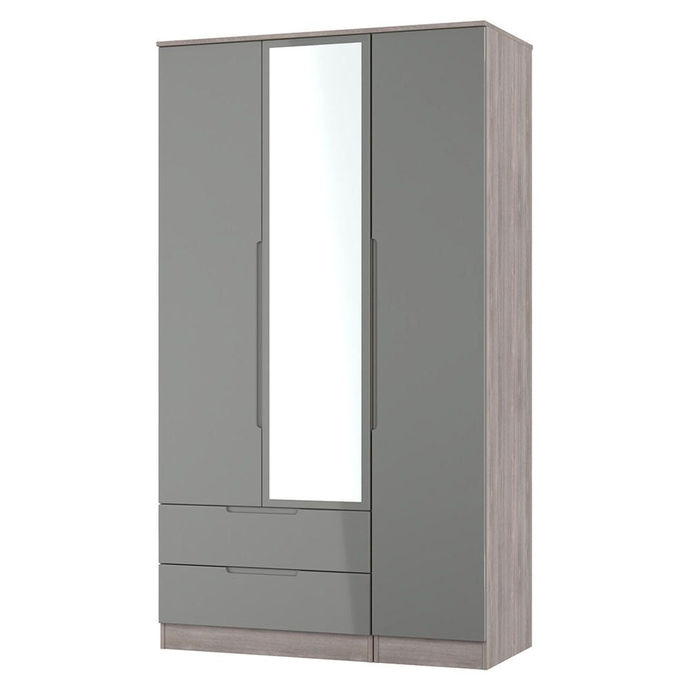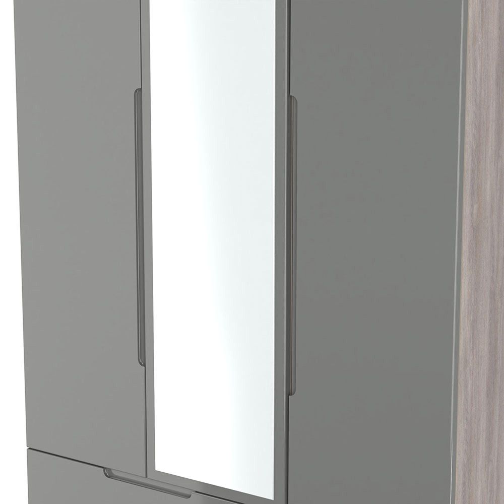 Milan Grey Gloss and Grey Oak 3 Door Tall Combi Wardrobe - 1 Mirror and LHF 2 Drawers
