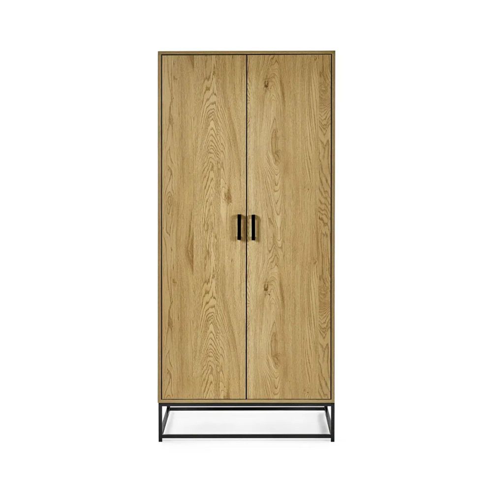 Item Code: HAR504 Keep your bedroom organised with this 2 door wardrobe. Finished in a warm light oak effect with beautifully natural grain texture and bold black accents, offering the perfect contrast. As the doors open, inside you'll find a spacious hanging rail for clothes and a practical shelf for folded items or shoes, all complemented by sleek black recessed handles. Its sturdy construction and industrial-inspired design make it a versatile addition to modern and minimalist interiors. Self-assembly is required. Modern and Industrial Styled Look : Finished in a warm light oak effect with natural grain and sleek black accents for a minimalist, industrial edge.