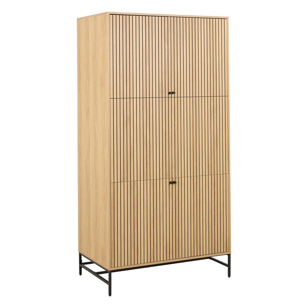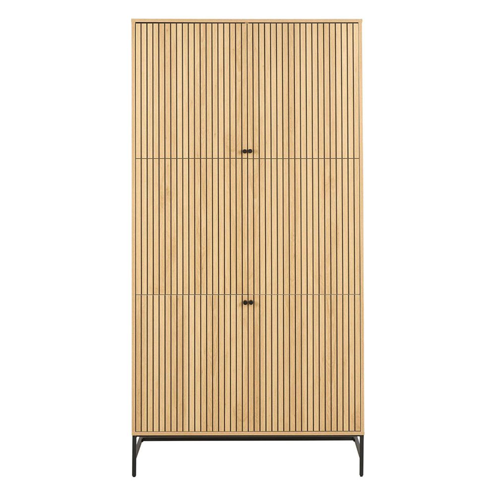 Item Code: H000023726 Albany wardrobe, frame, 4 doors and 6 shelves oak rough melamine, base matt black rough powder coated steel with clothes bar and lamella front. Adorned in an oak look with a lamella front, this wardrobe knows how to capture attention. Thanks to the lamelled doors it has a well-balanced appeal giving it an interesting look. With 6 shelves and a clothes bar, it offers ample storage, while the easy-care surface enhances its practicality. FSC certified.Free Delivery