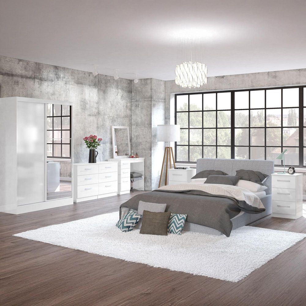 Item Code: LYN2SRMWHT Modern and sleek, the Lynx 2 door sliding wardrobe with mirror combines a high-gloss finish with bold silver detailing to make any space feel contemporary. Constructed from MDP (multiple density particleboard), this high-quality wardrobe features a sliding mirrored door plus an internal top shelf for additional bedroom storage.Choose from a choice of four high-gloss lacquer colour options: white & grey, black, white, or black & white, or alternatively there is an additional colour option combining high-gloss lacquered panels with walnut paper foil: walnut & black.The top shelf can support up to 15 kg of weight and the hanging rail can support up to 10 kg. The base panel of this wardrobe can support up to 20 kg of weight.