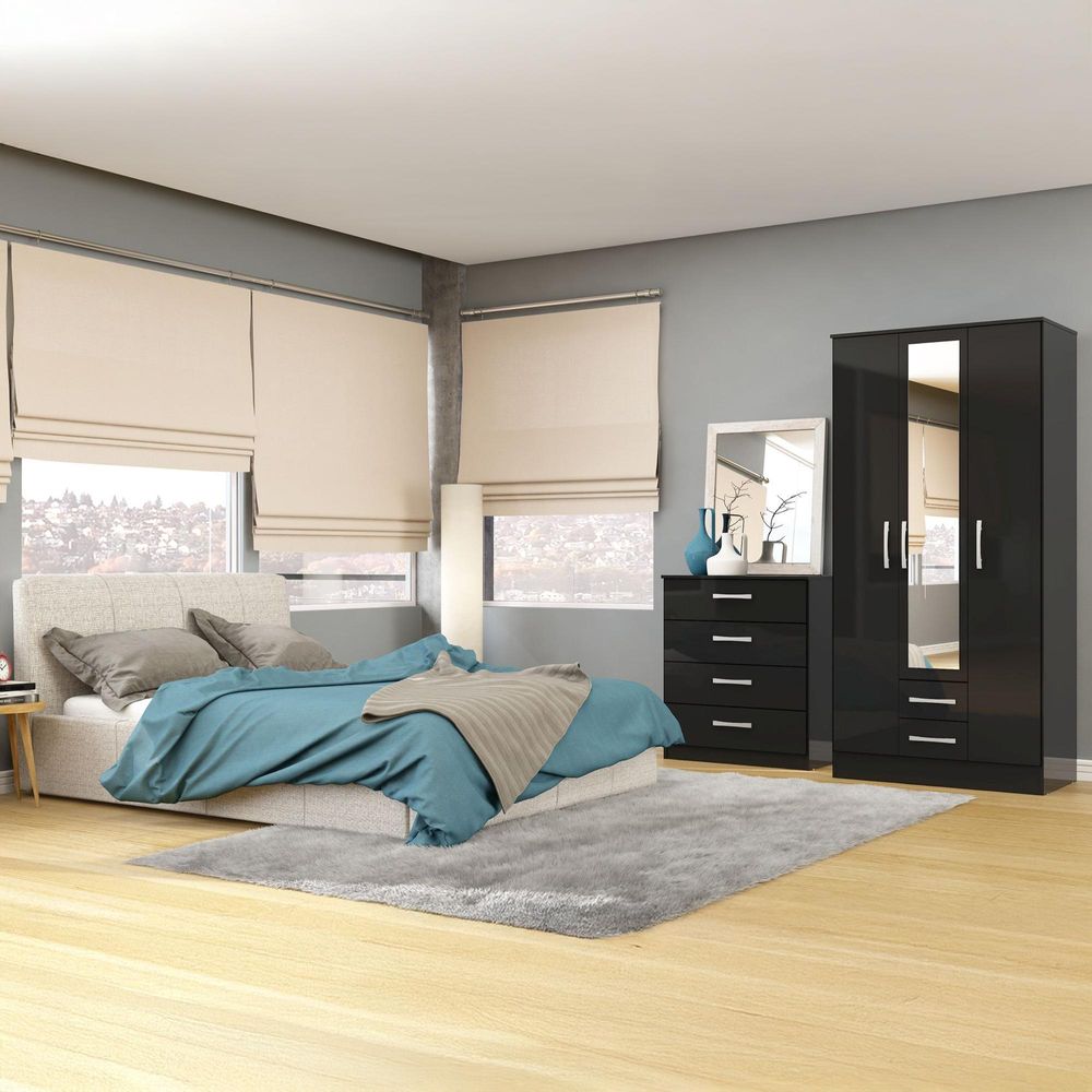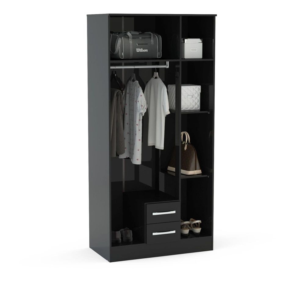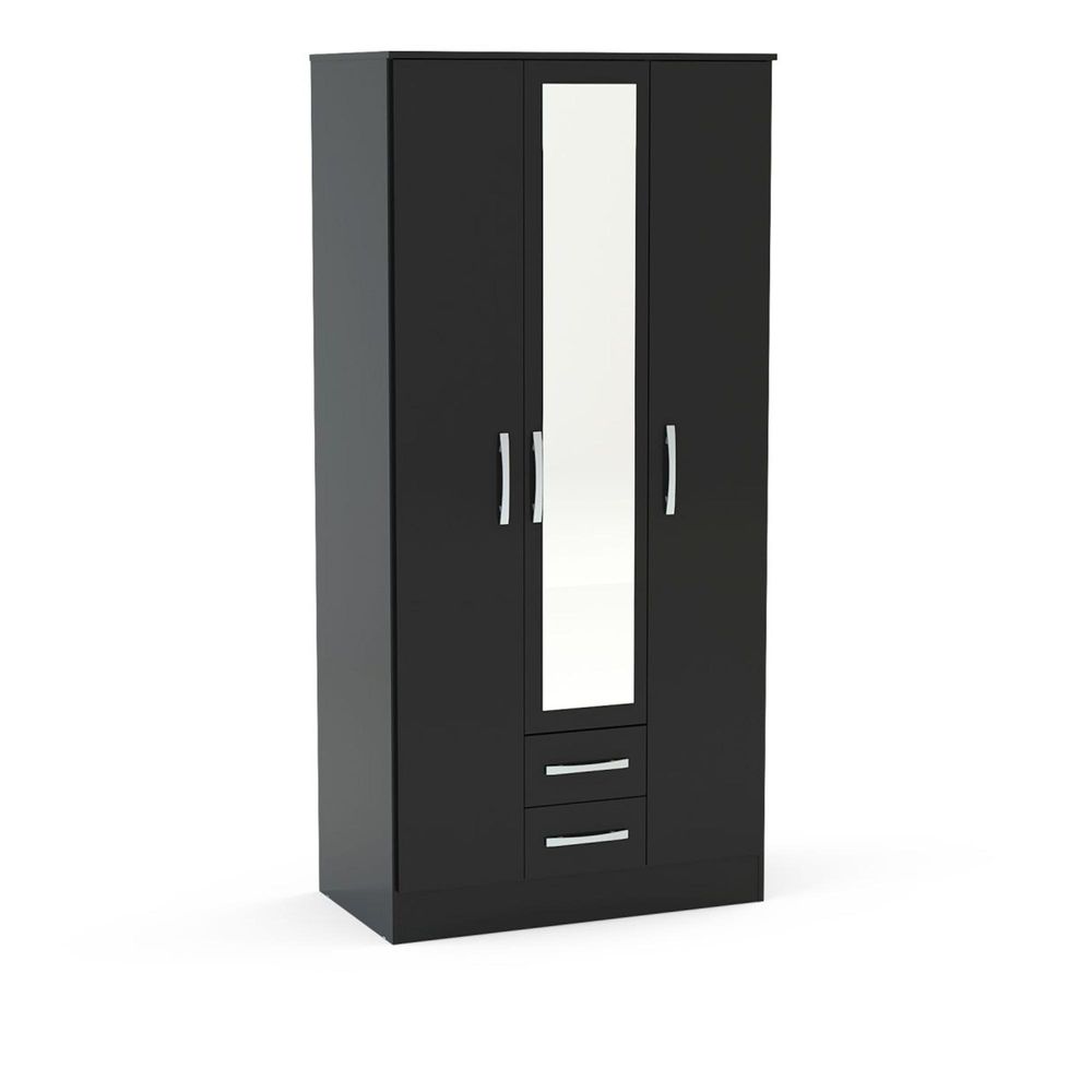 Item Code: LYN3DCBLK Modern and sleek, the Lynx 3 door 2 drawer wardrobe with mirror combines a high-gloss finish with bold silver detailing to make any space feel contemporary. Constructed from MDP (multiple density particleboard), this high-quality wardrobe features internal shelving for additional bedroom storage.Choose from four high-gloss lacquer colour options: white & grey, black, white, or black & white, or alternatively there is an additional colour option combining high-gloss lacquered panels with walnut paper foil: walnut & black.The large top shelf can support up to 15 kg of weight and the smaller shelves can support up to 5 kg each. The hanging rail can support up to 6 kg of weight and the drawers can support up to 2.5 kg each.