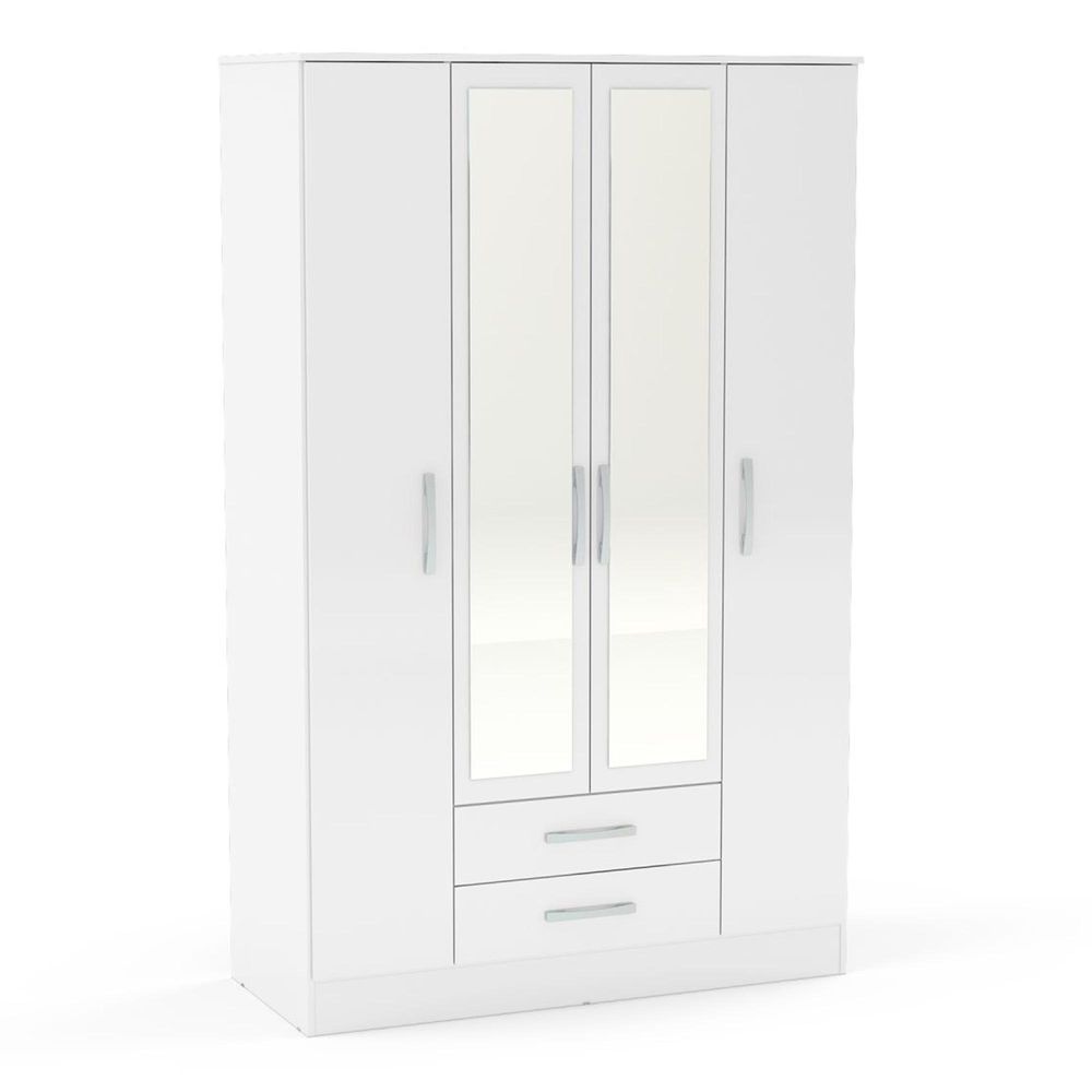 Item Code: LYN4DCWHT Modern and sleek, the Lynx 4 door 2 drawer wardrobe with mirror combines a high-gloss finish with bold silver detailing to make any space feel contemporary. Constructed from MDP (multiple density particleboard), this high-quality wardrobe features an internal top shelf for additional bedroom storage.Available in a choice of four high-gloss lacquer colour options: white & grey, black, white, or black & white, or alternatively there is an additional colour option combining high-gloss lacquered panels with walnut paper foil: walnut & black.The top shelf of this wardrobe can support up to 15 kg of weight and the hanging rail can support up to 12 kg. Each drawer can support up to 4 kg.