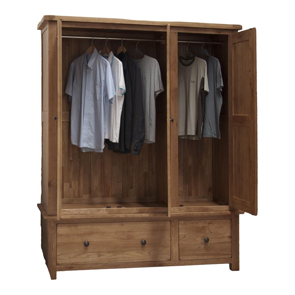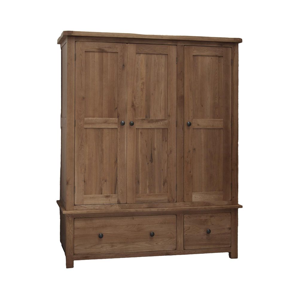 The Rustic Oak 3 Door 2 Drawer Wardrobe is a beautifully crafted, large-capacity wardrobe designed for those who need generous storage without compromising on quality or style. Constructed from 100% solid oak, this piece showcases the natural beauty of the wood through a rustic lacquered finish that protects the surface while enhancing its warm, grain-rich character.