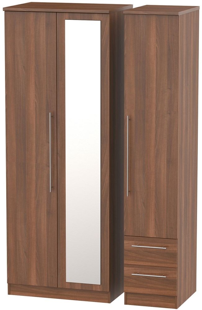 Sherwood Walnut Effect 3 Door Tall Combi Wardrobe - 1 Mirror and RHF 2 Drawers