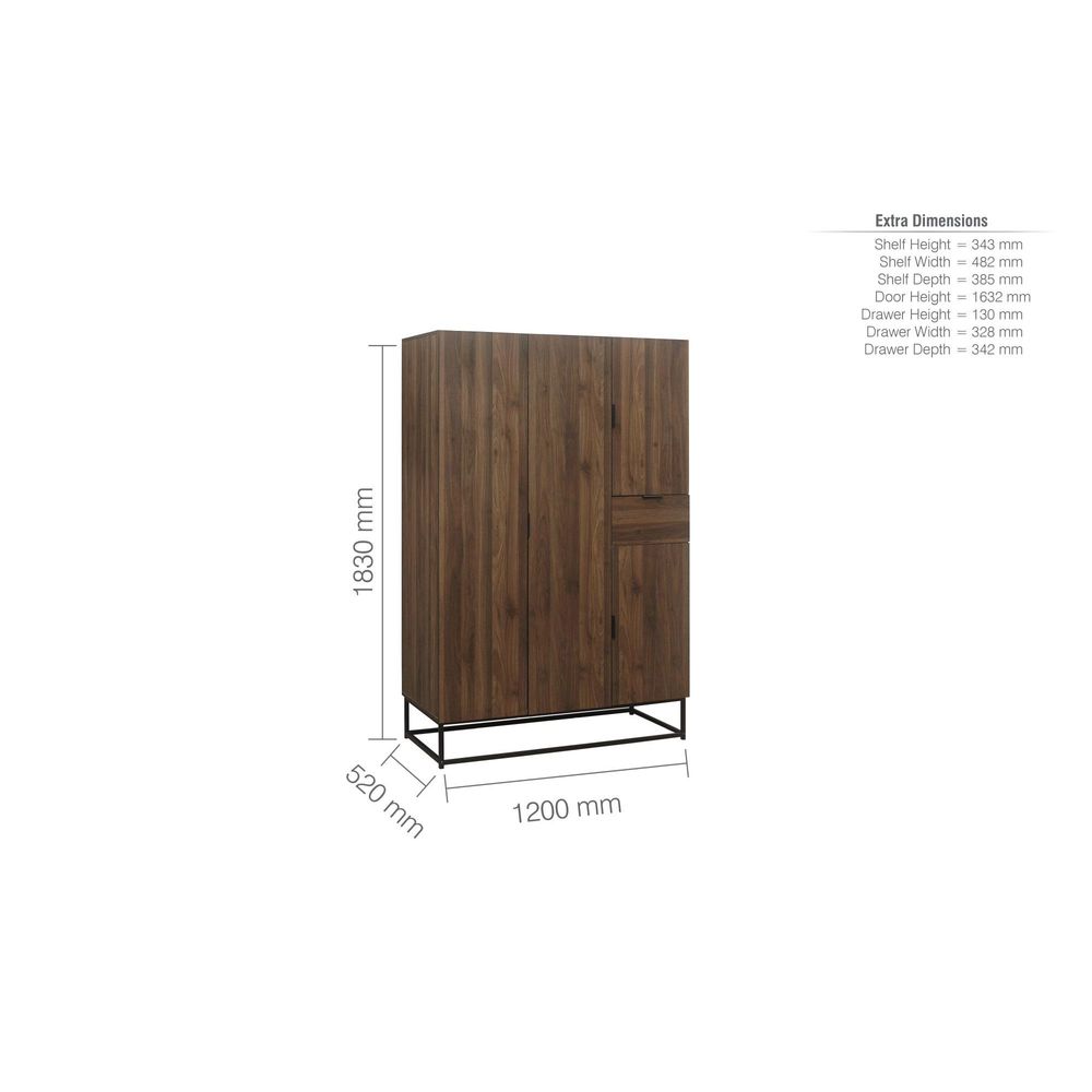 Item Code: HOSWD4WAL Crafted from a mix of metal and walnut effect wood, the Houstons distinctive, modern style oozes sophistication inspired by modern architecture.The Houston 4 door wardrobe offers ample space and features internal shelves along with a handy drawers for storing clothing and accessories.This versatile range is crafted from particle board with walnut effect finish.Care instructions: Wipe carefully with a soft, dry cloth.