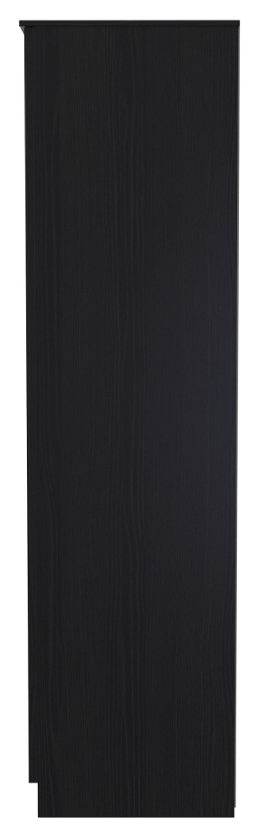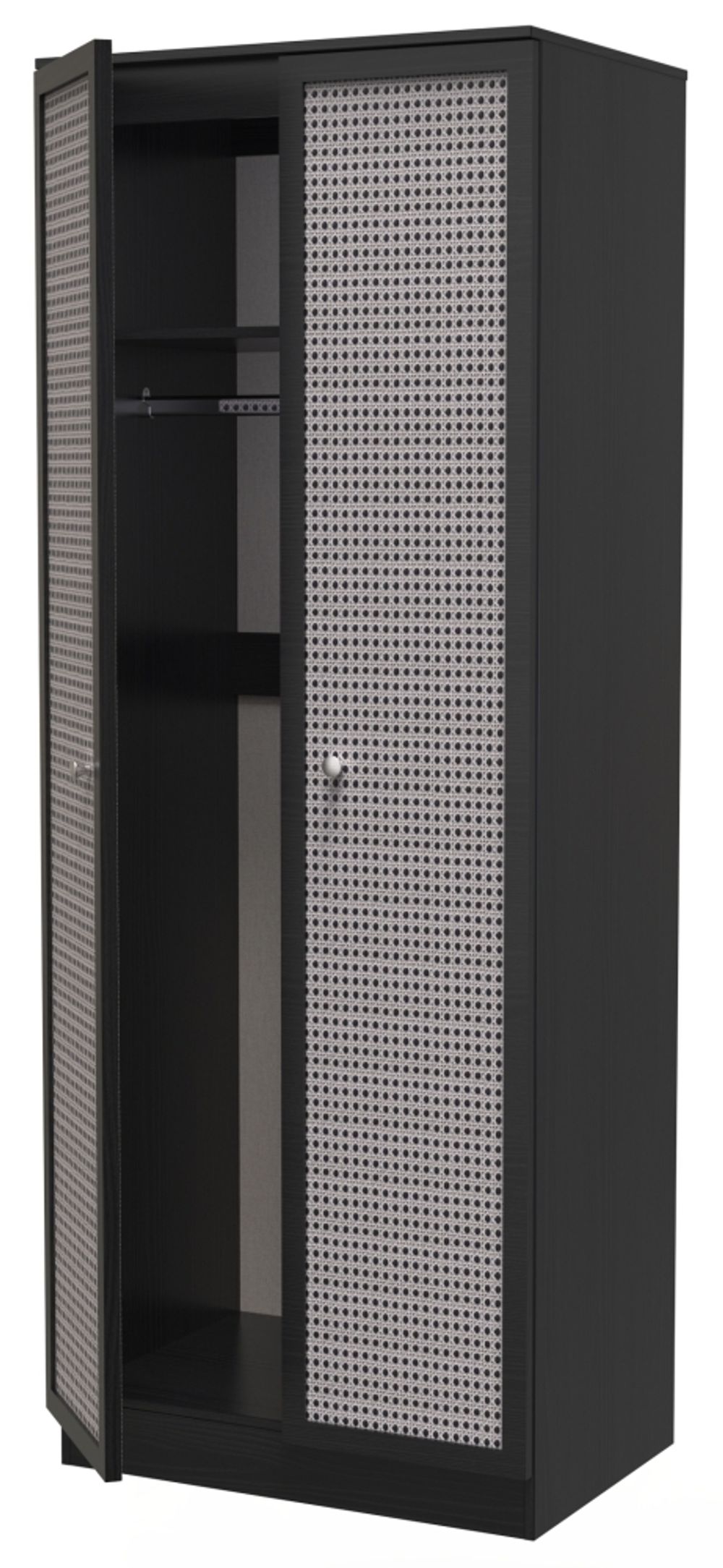 Item Code: RAT080B This hinged two door tall wardrobe is the perfect addition to any bedroom. Made from durable particle wood and finished with a black ash veneer, this wardrobe provides ample storage space. The rattan detailing adds a perfect touch of style, while the hinged doors make it easy to open and close. A great choice for keeping your clothes organised and tidy!