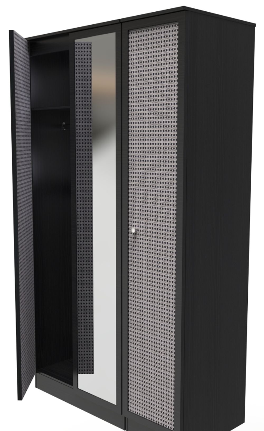Item Code: RAT137B This hinged wardrobe features a classic black ash finish and is constructed from sturdy particle wood. It has three doors complete with rattan detailing, offering ample storage space. Mirrored accents add a touch of style and functionality, making it a great addition to any room.