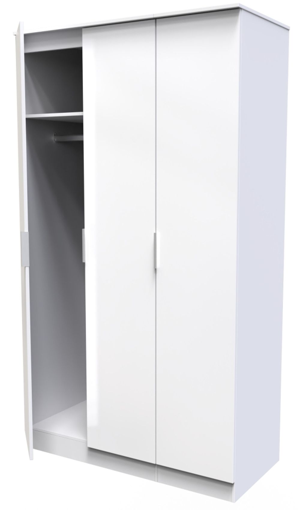 Item Code: PLY140 This beautiful tall wardrobe is the perfect choice to give your bedroom a stylish and contemporary update. Crafted from particle wood, it features 3 hinged doors with a sleek white gloss finish. Its space-saving tall design offers plenty of storage for your clothes and accessories. Its hassle-free pre-assembled construction makes it easy to install.
